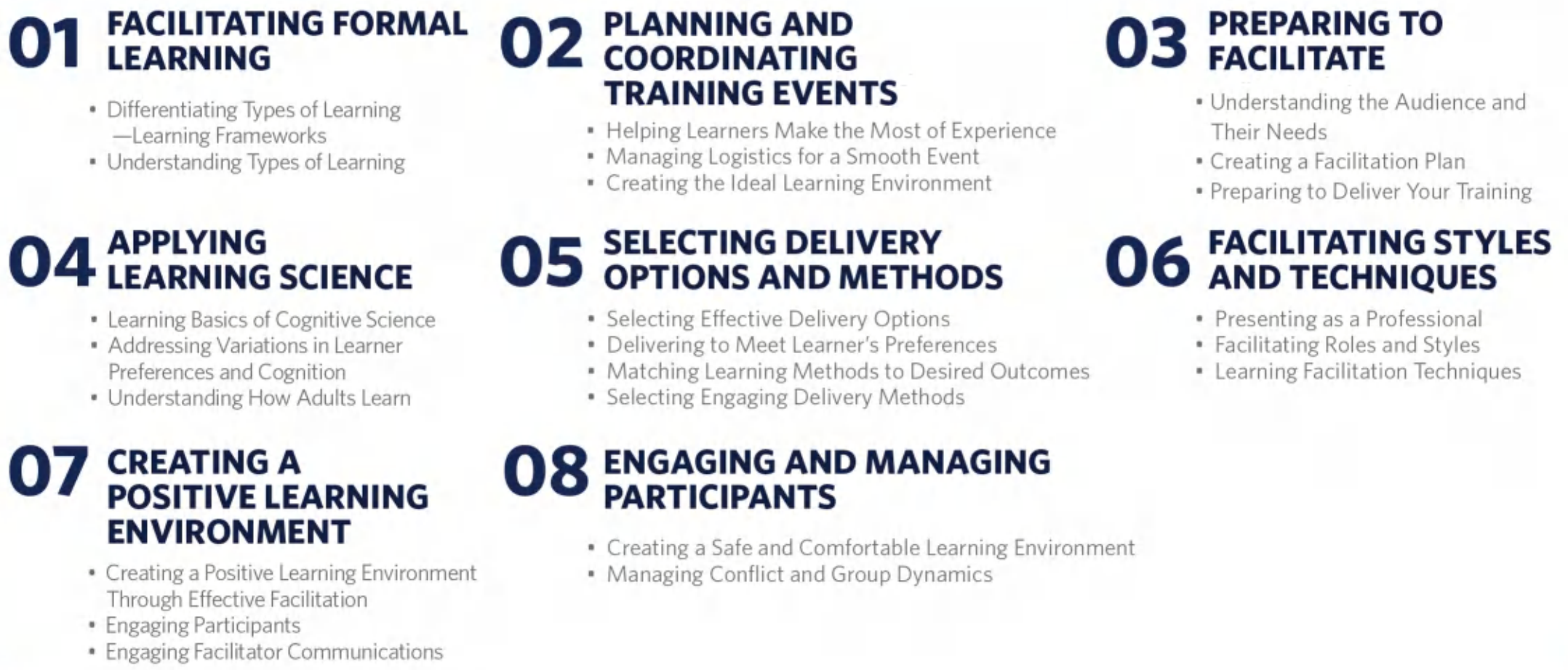 New and experienced trainers and facilitators from any industry and those who want to gain a comprehensive skill set for facilitating and delivering instructor-led learning events will benefit from this program. In addition to professional trainers and facilitators, training coordinators, training managers, learning consultants, instructional designers, independent consultants, educators, and professors may benefit if facilitation is part of their jobs. Professionals with unique domain expertise who have been asked to teach others, customer/technical/software educators, or those who lead others may also find valuable grounding in core training and facilitation concepts.