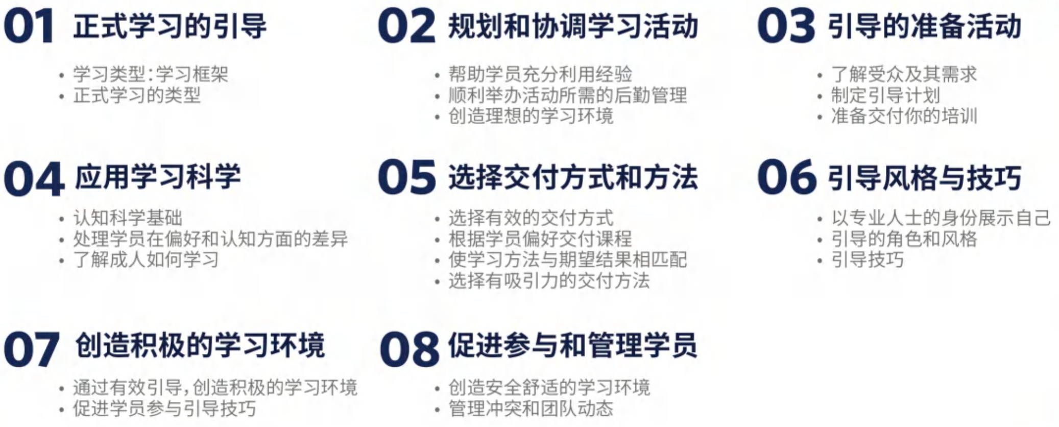 本证书课程内容覆盖整个培训周期,包括策划和准备培训活动、管理学习环境和吸引学员参与课堂教学,以及培训结束后的跟进活动,继而为培训与学习提供后续支持。我们还将介绍学习背后的科学——学员的需求和偏好、培训技巧、课堂环境以及结构完善的教学材料与影响学习结果的原因和方式。本课程结束时,您还将有机会在技能实践中展示自己的技巧,从同行和ATD引导师处获得反馈和指导。